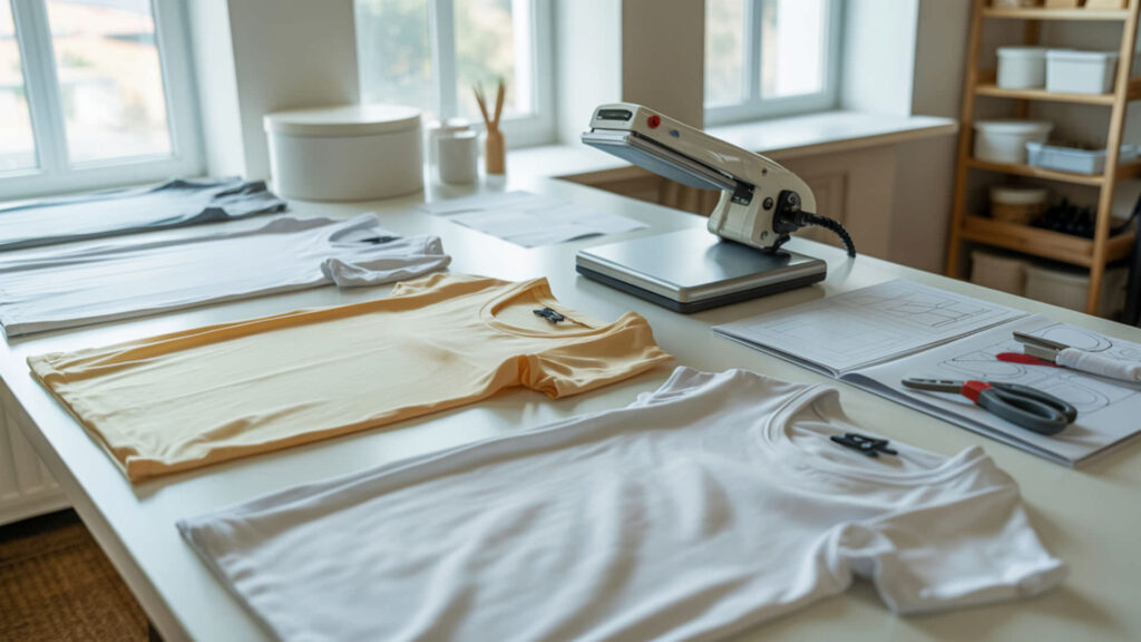 Polyester shirts arranged neatly in a clean home crafting studio.