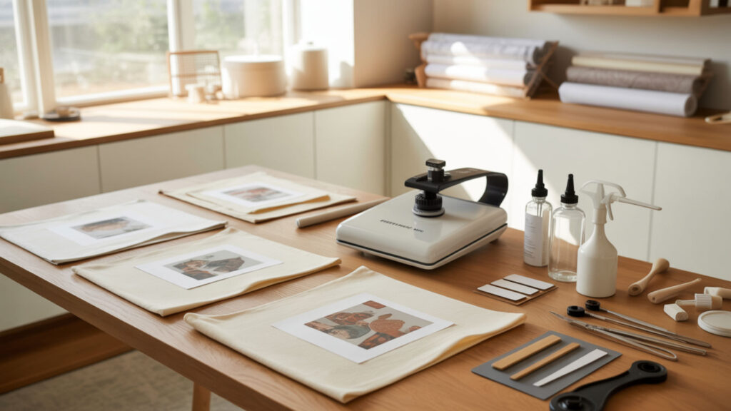 A dedicated sublimation printer set up with essential cleaning tools in a tidy workspace.