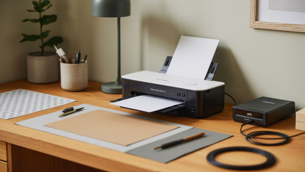 A tidy craft studio setup with a printer and cleaning supplies arranged neatly.