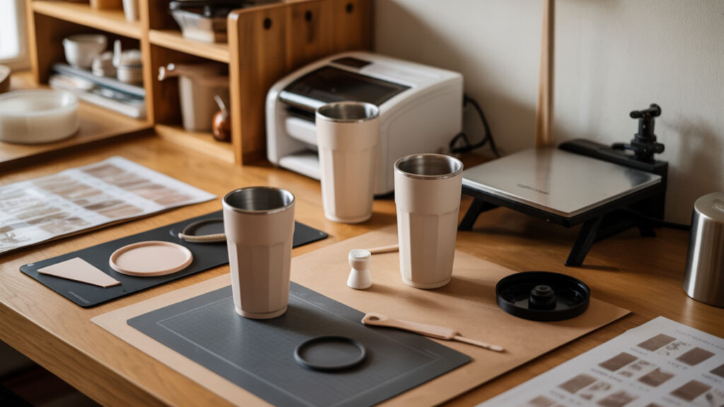 A crafting workspace displaying tumblers and epoxy tools neatly arranged.