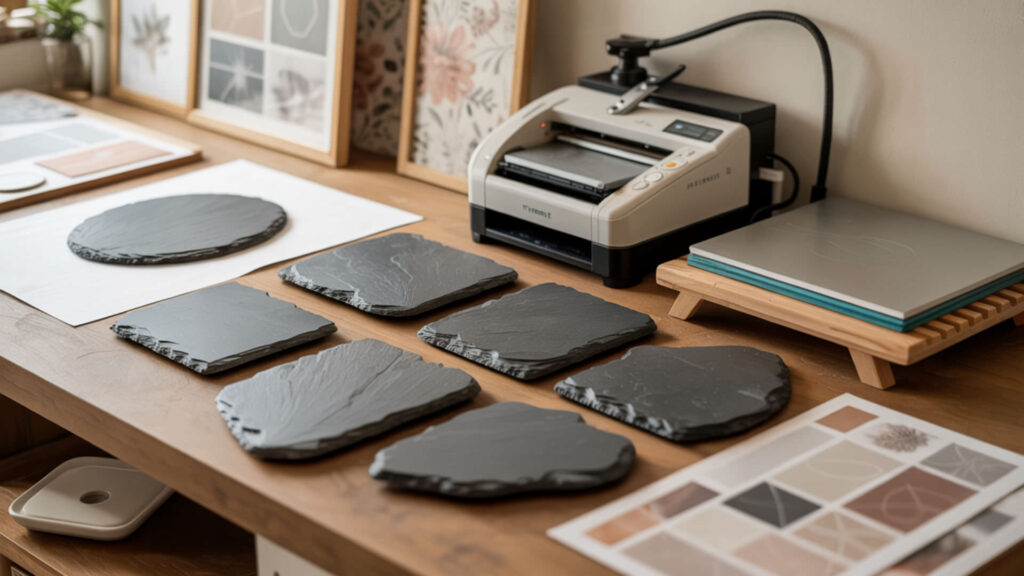 A cozy craft studio displaying a selection of slate blanks with tools on a tidy desk.