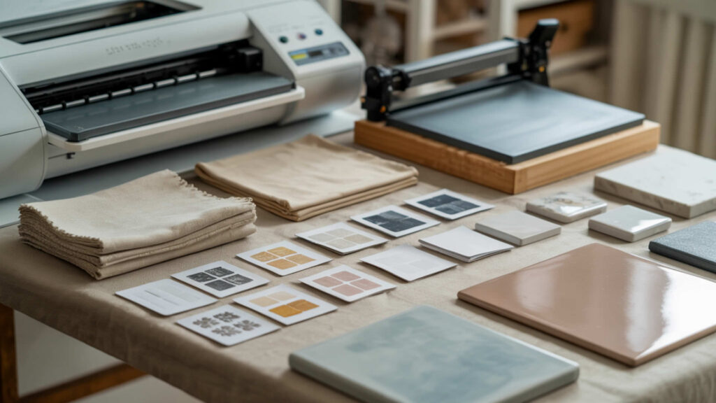 A home craft setup focused on running a sublimation test print before production.