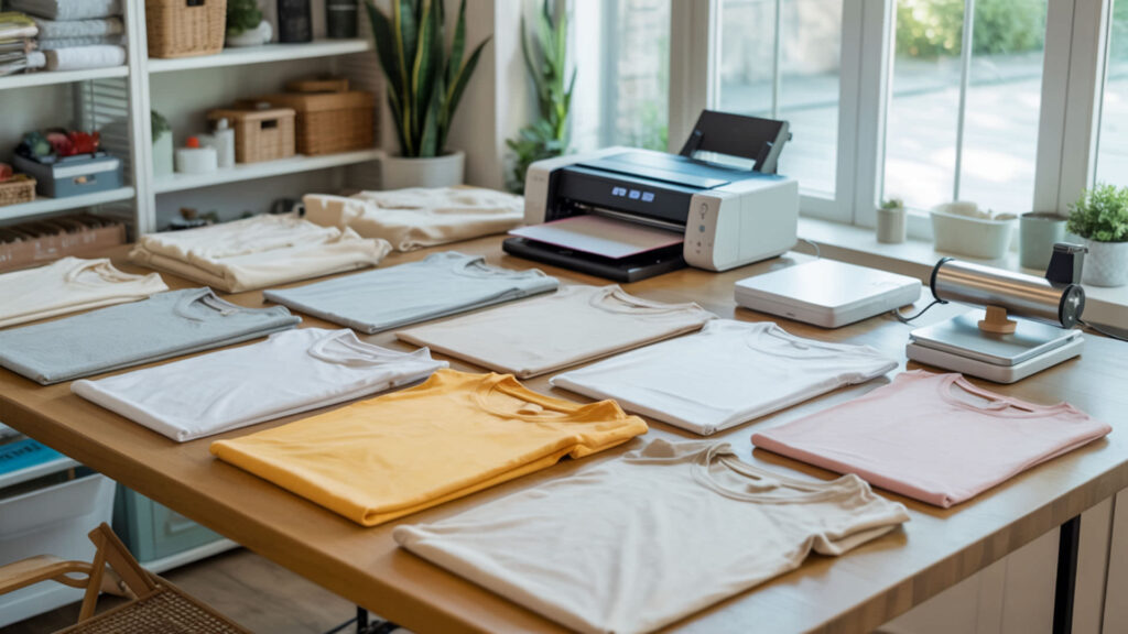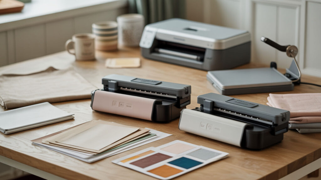 A home craft studio comparing eco-solvent supplies with sublimation materials.
