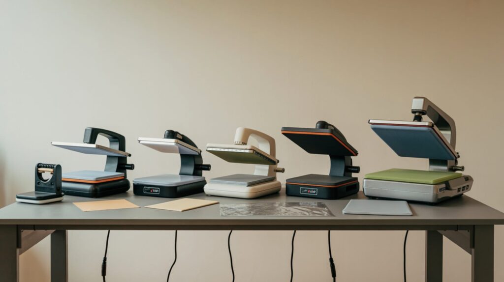 A comparison of popular heat press styles commonly used for sublimation printing projects.