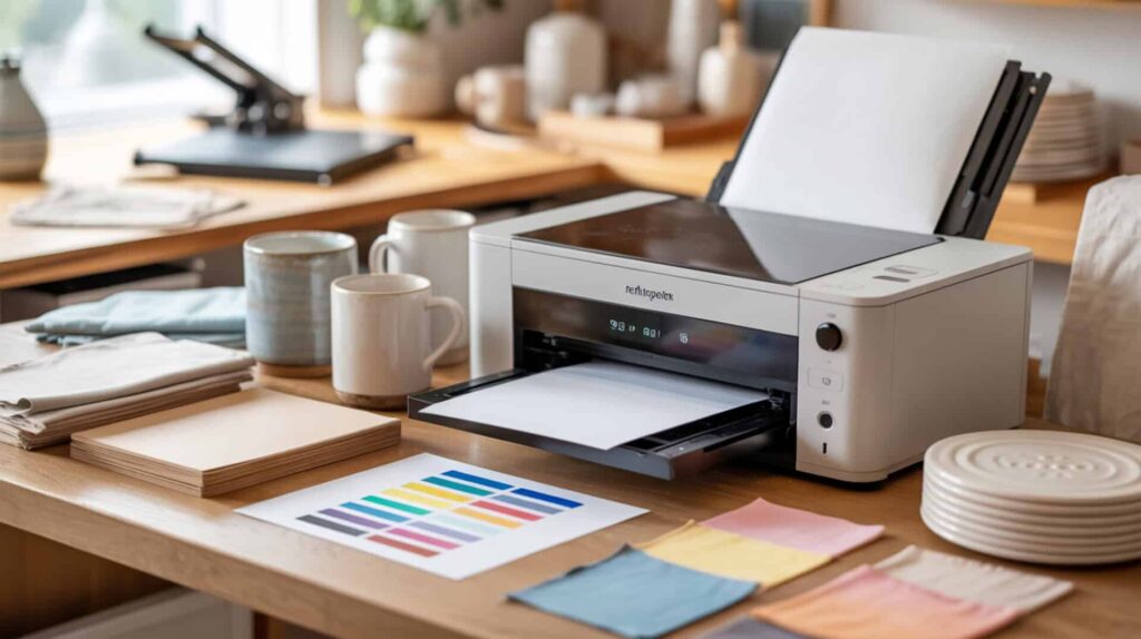 A home studio setup showcasing a compact sublimation printer with common craft blanks.