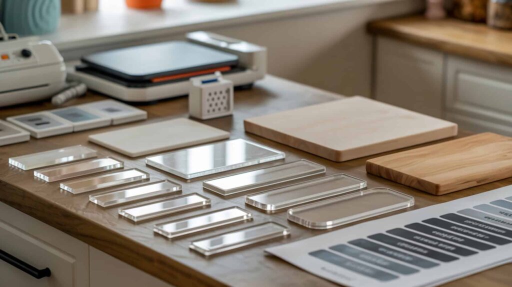A home studio setup comparing popular sublimation blank products for crafting and gifting.