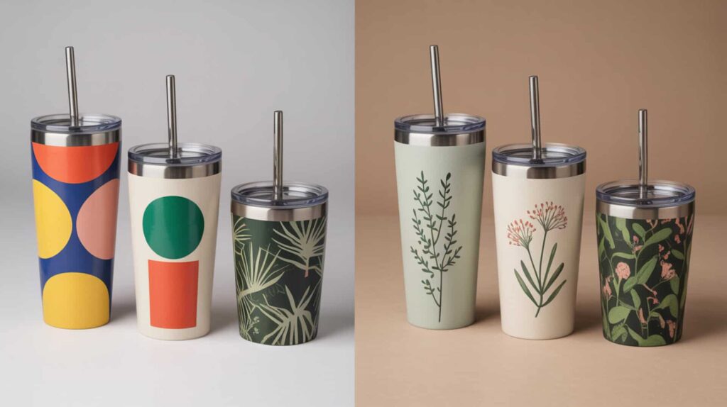 Ceramic mugs are a classic for sublimation because prints always turn out so well—the smooth polymer-coated surface accepts dye transfer with consistent results. Tumbler wraps (especially 20 oz skinny straight styles) remain popular for their visual impact and gift appeal. Both abstract geometric patterns and botanical nature-inspired themes perform well in current markets. Texture simulation adds perceived quality to designs without affecting press settings, making layered botanical and textured geometric designs particularly appealing to buyers.