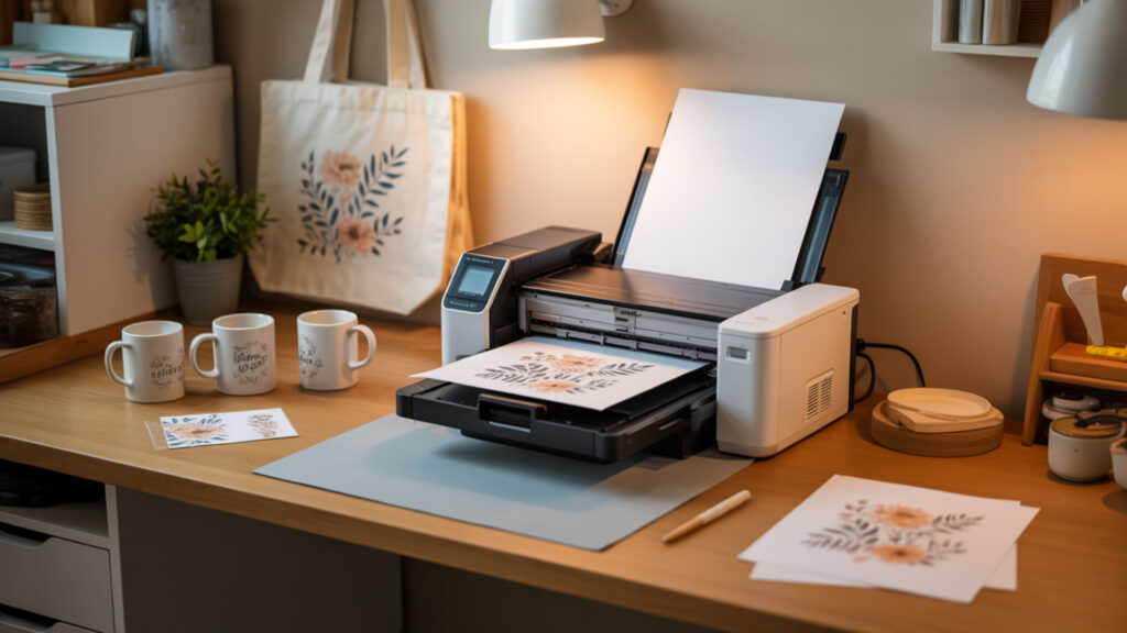 Dye-sublimation printing uses chemical dye diffusion to bond designs permanently into polyester fibers through heat press application. A Cricut maker cuts vinyl, paper, and fabric for craft projects but does not print images. Sublimation creates vibrant, washable designs while Cricut produces layered vinyl decals and cutouts.