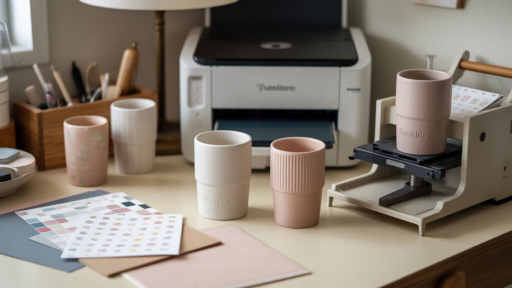Creating sublimation tumblers requires specialized equipment including a tumbler press or convection oven, sublimation wrap for full designs, and heat tape to secure transfer paper during heating cycles. Heat tape prevents design shifting that causes ghosting artifacts on finished products. Sublimation wrap templates simplify accurate design placement around cylindrical surfaces for seamless full-coverage prints. Press-based heating techniques for cylindrical drinkware parallel mug sublimation methods covered in our tumbler press mug sublimation guide.