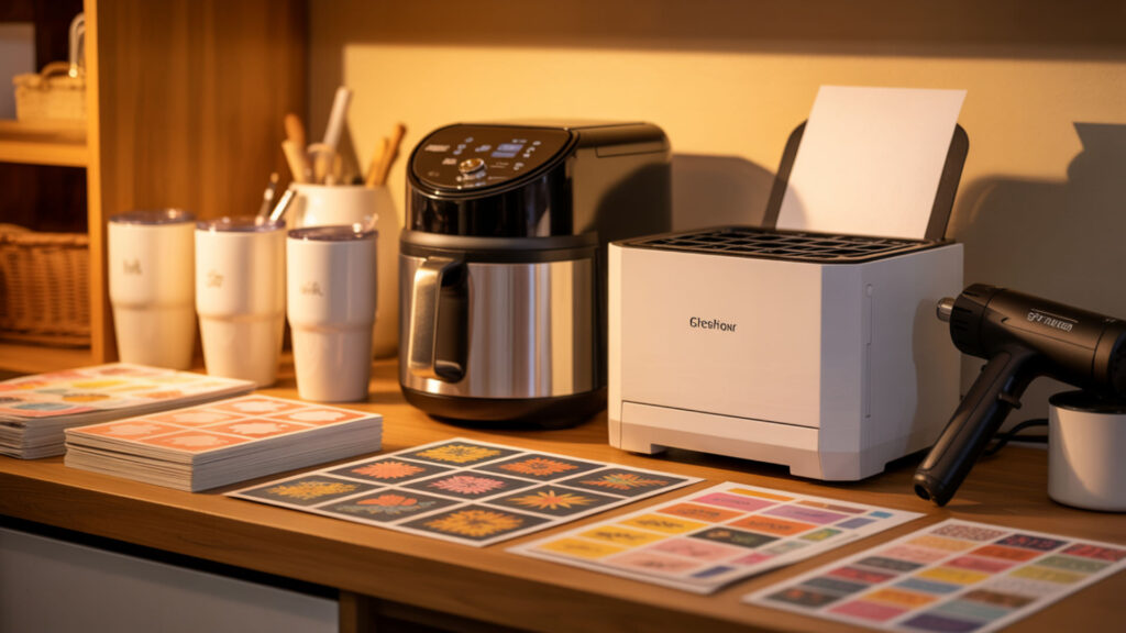 Print mirrored designs onto transfer paper sized for your tumbler dimensions, trim excess, and secure tightly with heat tape ensuring smooth contact without air bubbles. Clean tumblers thoroughly with lint roller or rubbing alcohol before applying transfer paper to prevent contamination. For convection oven methods, wrap tumblers in shrink sleeves and heat-shrink before baking at 375°F for 5–6 minutes with rotation. Equipment selection impacts transfer consistency—heating options appear in our convection oven heat press equipment comparison guide.