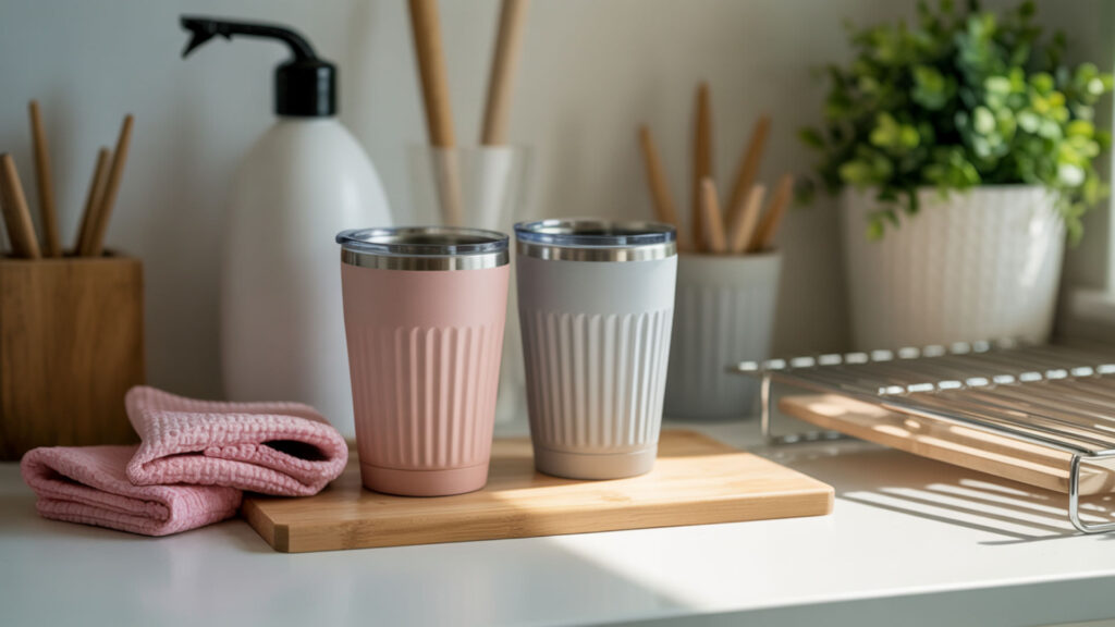 Use warm soapy water with a soft bottle brush, avoiding abrasion from steel wool or scouring pads that remove polymer coating layers. Disassemble all lid components and wash separately to prevent mold growth in seals and straws. Rinse thoroughly, dry immediately with a clean towel, and avoid soaking the tumbler for extended periods that could weaken adhesive bonds on lid components.