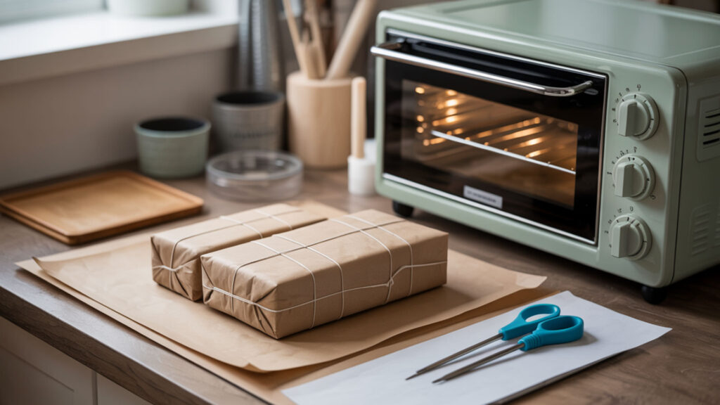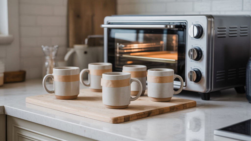 Place the prepared mug on parchment paper in a toaster convection oven preheated to 385–400°F and bake for approximately 12–15 minutes. Thermal equilibrium takes longer in smaller ovens, so verify temperature accuracy with a separate thermometer. Time may vary based on mug thickness and the specific wrap method used.