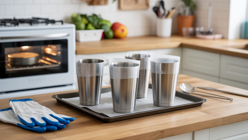 A household convection oven sublimates tumblers effectively when dedicated exclusively to crafting, using heat transfer through convection airflow to surround the cylinder with even temperature. The tumbler blank must have a polymer coating for the dye to bond. Preheat to 375°F, place the wrapped tumbler inside, and bake for 5–6 minutes while rotating halfway through.