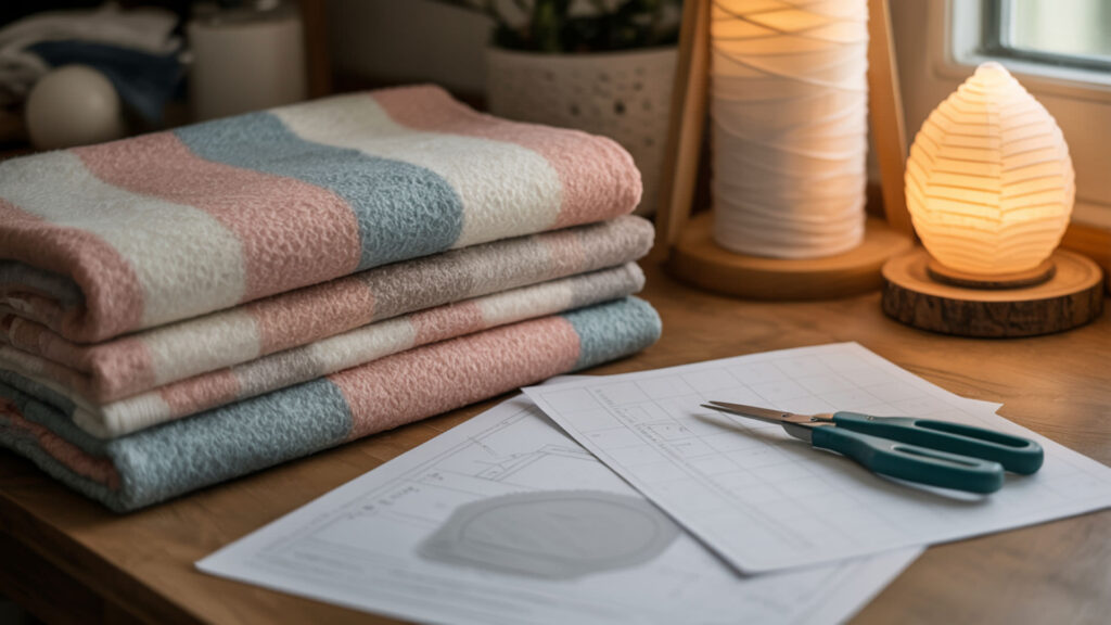 A folded blanket and craft materials arranged in a setting focused on durability.