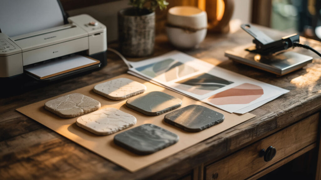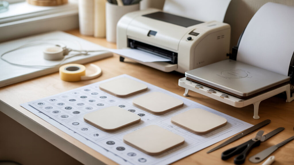 Transfer paper carries sublimation ink to coaster surfaces when heat converts solid dye into gas that bonds with polymer coatings. Print designs mirror-image using sublimation-specific settings—high-quality photo paper mode with maximum resolution produces sharpest results. Secure transfers with heat-resistant tape along edges to maintain alignment during pressing, and apply consistent pressure to ensure complete surface contact throughout the heating cycle.