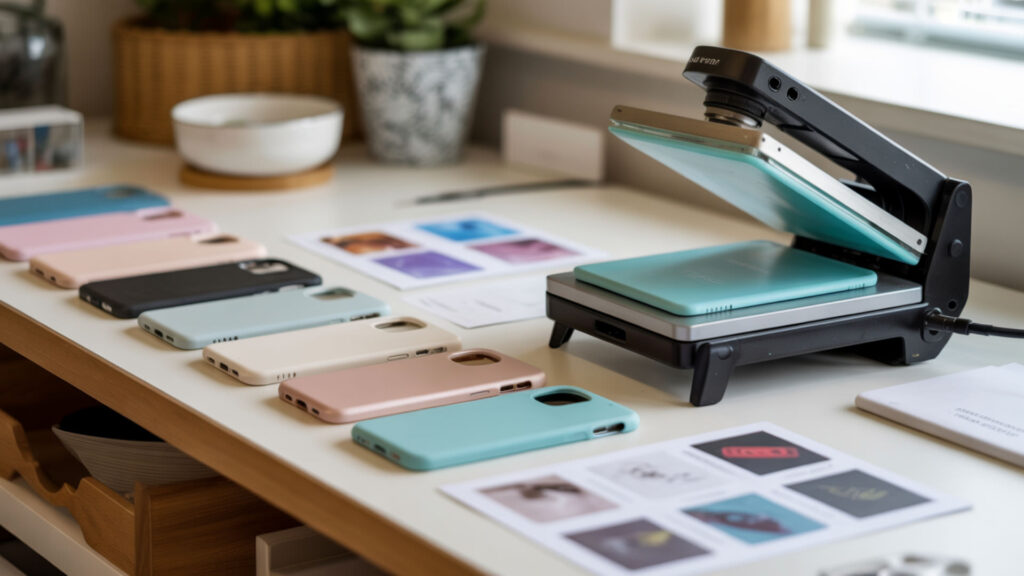 Blank phone cases and design sheets placed together on a clean craft desk.
