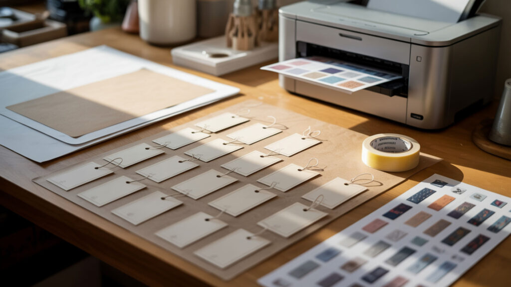 Clothing tag blanks displayed with crafting tools on a tidy workspace.