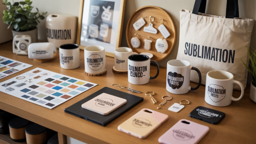 A selection of popular sublimation-ready products arranged in an appealing display.