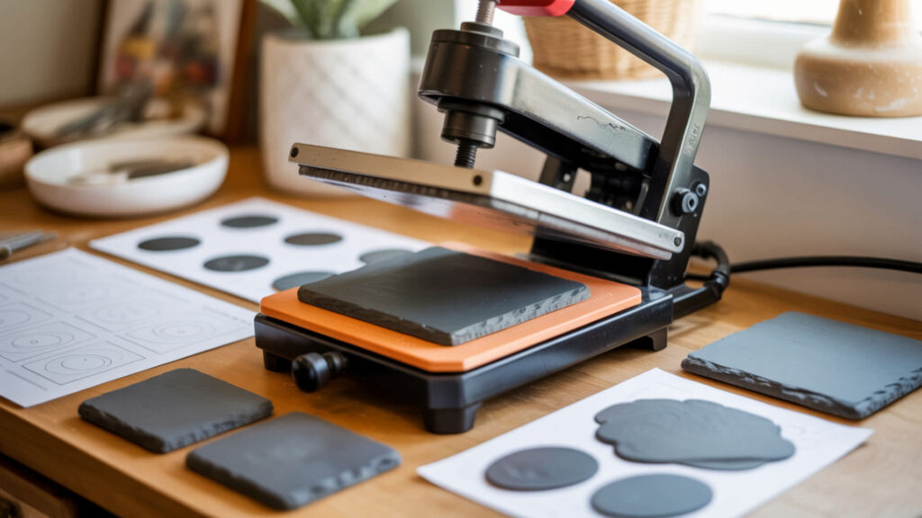 - Press at 385–400°F for 6–9 minutes with firm pressure—longer times than metal due to slate’s thickness.