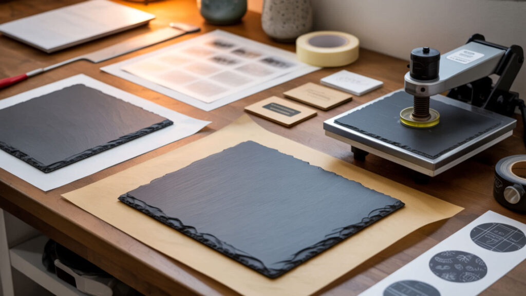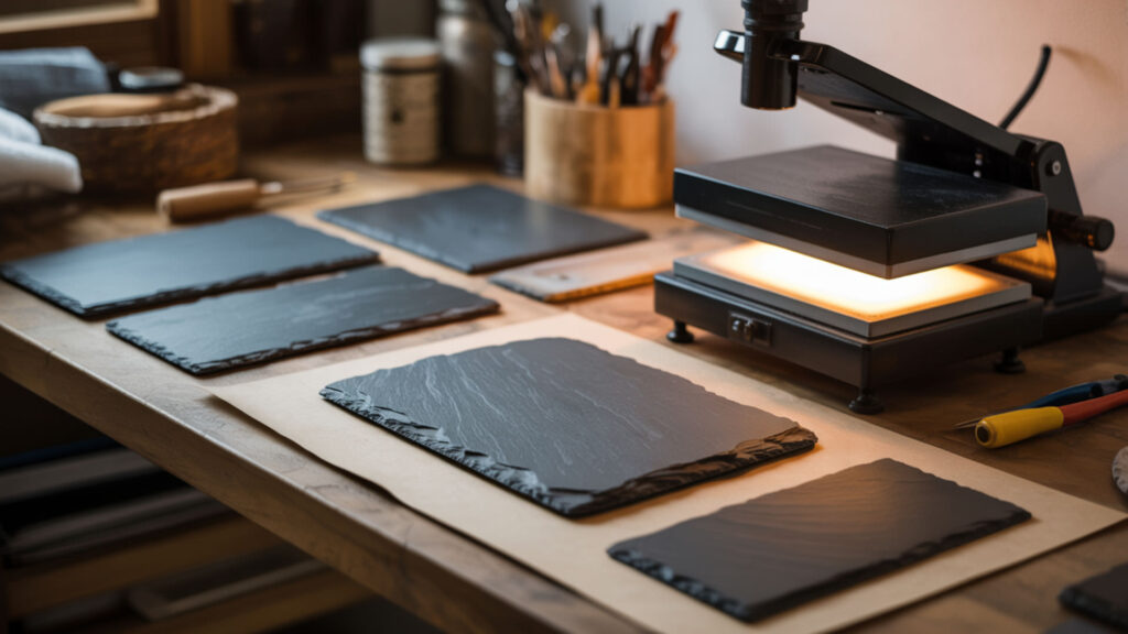 Quality polyester coating is the key to stable, vibrant images on slate—without proper polymer treatment, dye cannot bond permanently to the porous stone surface. Pre-coated slate blanks from reputable suppliers provide consistent results at 385–400°F for 6–9 minutes with firm pressure. Preheat to prevent cracking and allow gradual cooling to master this rustic substrate.
