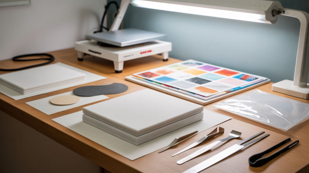 Preventing tape marks requires understanding surface energy and contact angle relationships between tape adhesive and substrate coatings. Low contact angle indicates stronger tape bonding to the surface, increasing imprint risk when pressure is applied. Place tape only outside the visible print area, use the minimum amount needed to secure the transfer, and apply protective paper beneath tape edges on sensitive substrates. Controlled pressure reduces tape edge indentation—our sublimation kit guide includes quality tapes, pressing aids, and pressure guides that prevent marks.