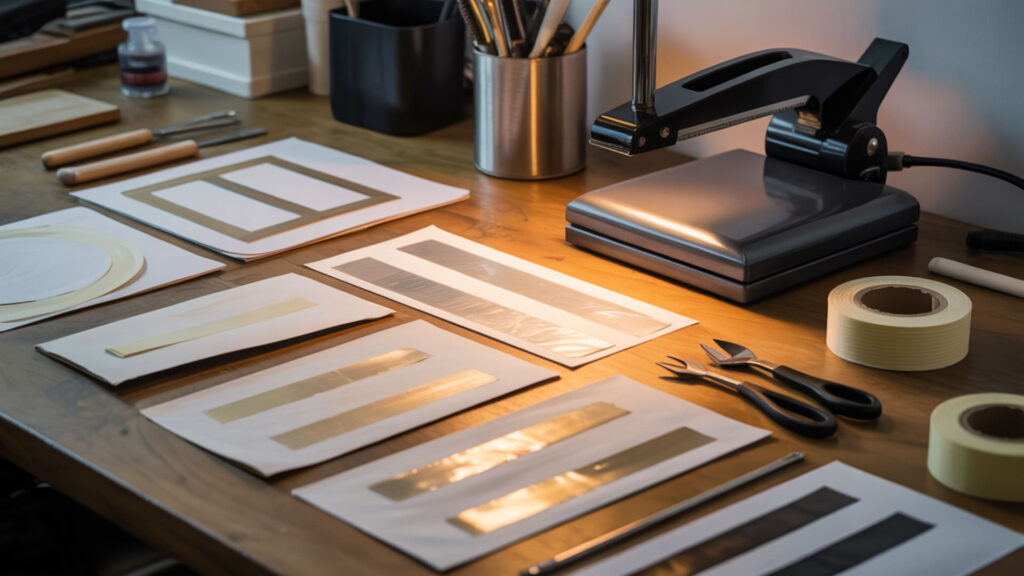 Press marks differ from ghosting and color bleed—marks are physical indentations or residue from tape, while ghosting creates duplicate shadow images from paper movement and bleed spreads ink beyond design boundaries. However, underheating can cause tape to lift mid-press, creating movement that produces both tape marks and ghosting simultaneously. Proper temperature maintains tape adhesion throughout the press cycle.