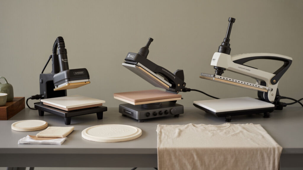 The three main heat press styles—clamshell press, swing-arm press, and pneumatic press—differ in how they apply pressure and heat to substrates. Clamshell presses risk uneven pressure due to their hinge angle affecting contact across the platen surface. Swing-arm presses provide even downward pressure for more uniform results, while pneumatic presses use air pressure for consistent, repeatable force on every press. Because swing-arm press designs and pneumatic systems affect output quality significantly, our guide on best heat press machines for sublimation compares features and price points.