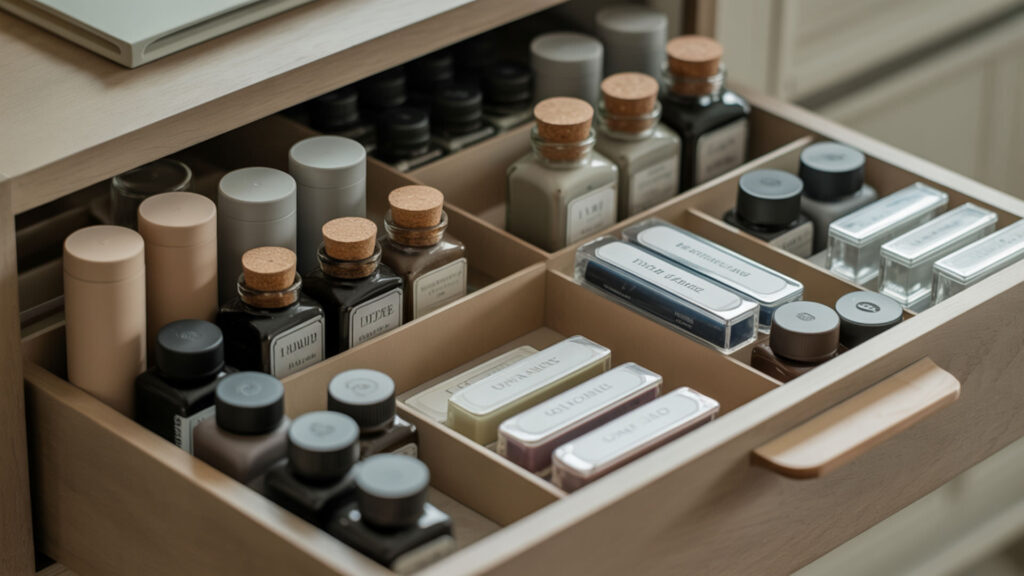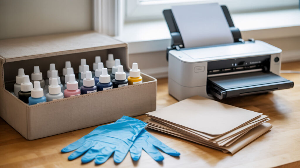 Ink supplies stored neatly in a well-ventilated home craft space.