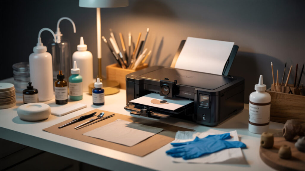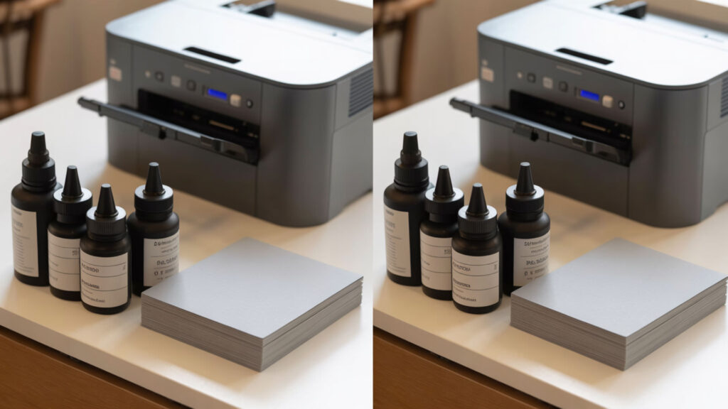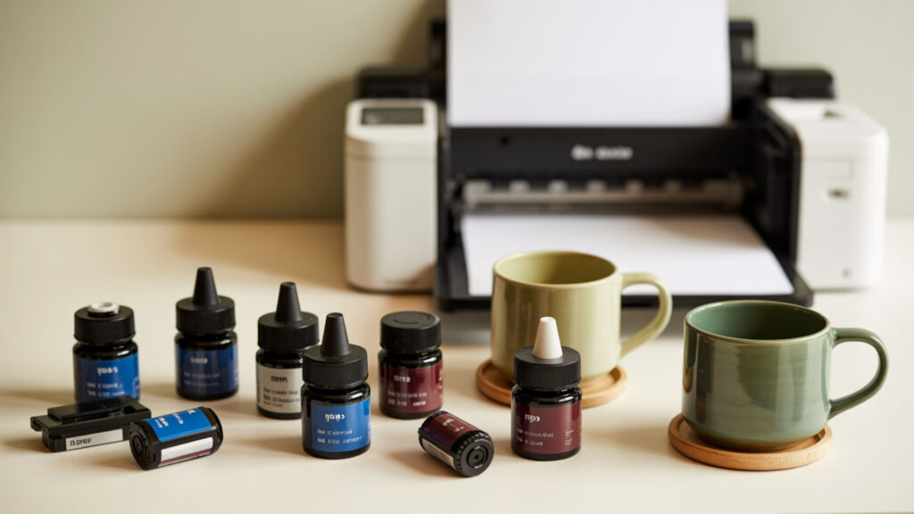 Bulk ink bottles and cartridges arranged beside finished blanks.