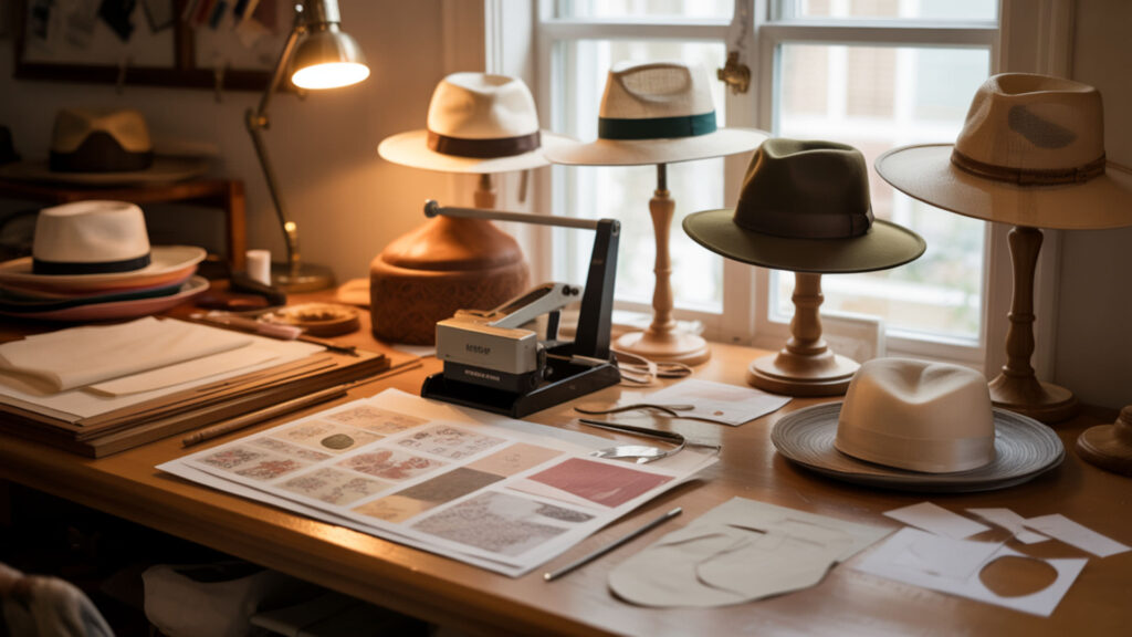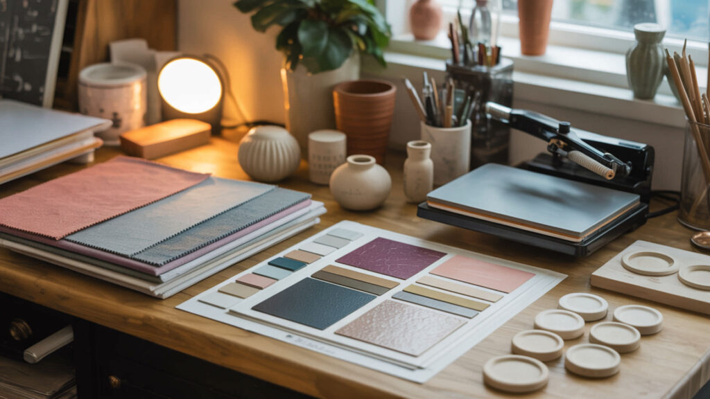 Pressed samples and transfer sheets displayed on a creative worktable.